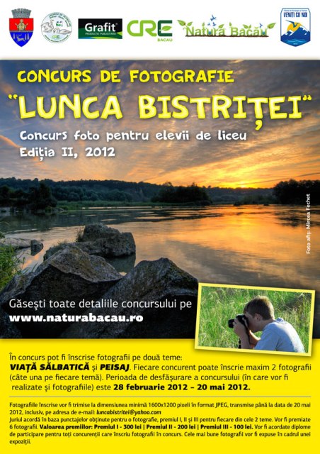 Centrul Regional de Ecologie a dat astăzi startul celei de-a doua ediţii a Concursului de fotografie pentru elevii de liceu „Lunca Bistriţei”. Elevii din liceele şi colegiile din municipiul Bacău sunt invitaţi să trimită până pe data de 20 mai 2012 fotografii din zona râului Bistriţa, realizate pe raza mun. Bacău, de la podul de cale ferată de lângă Parcul Gherăieşti, până la barajul lacului de la Insula de Agrement.