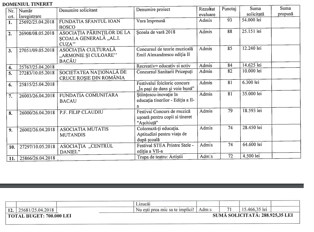 Pentru prima dată în ultimii ani, au fost scoase din programul finanțărilor nerambursabile domeniile cultură, sport, educație și mediu, suma totală scoasă la concurs fiind considerabil mai mică: 1,5 milioane lei (700.000 la tineret și 800.000 la social).
