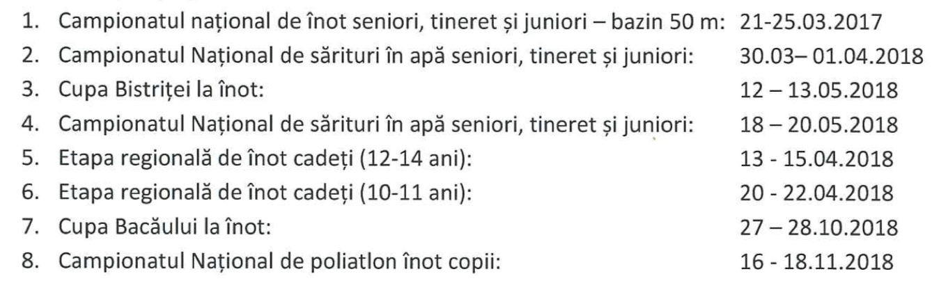 - 1. punerea la dispoziție către Federația Română de Natație și DJST Bacău a Bazinului de înot pentru organizarea a 8 evenimente de natație: 4 campionate naționale, două etape regionale și două cupe locale la înot;