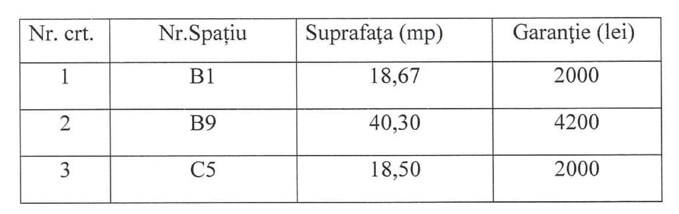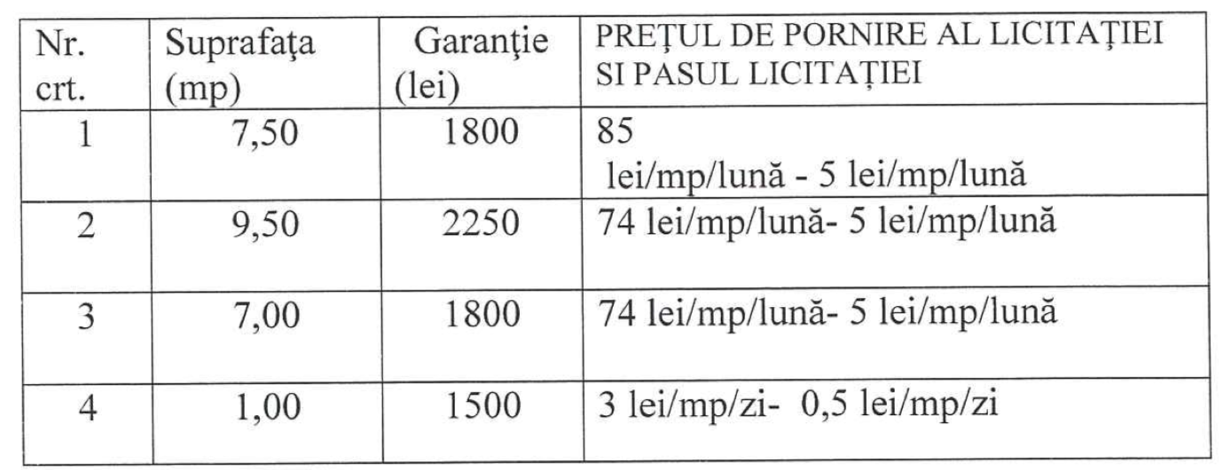 - 20A. închirierea a trei spații aflate în incinta halei Pieței Centrale, prin licitație publică deschisă, la prețul de pornire de 30 lei/mp/lună, pe o perioadă de 5 ani;