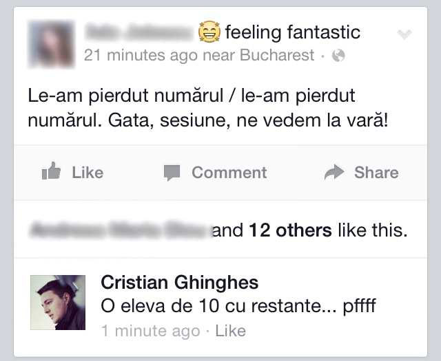 1. O fostă elevă de 10, acum studentă la două facultăți, se supără pentru o replică funny pe care i-am dat-o la o postare cel puțin la fel de glumeață și mă răsplătește cu un block. Nu-i dau numele pentru că aveam și încă am așteptări mari de la ea. Profesional vorbind. Prietenii știu de ce.