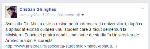 2. La aproape o săptămână după ce i-am etichetat în postarea mea de pe Facebook în care am anunțat articolul despre mizeriile pe care le fac la Universitatea de Arhitectură „Ion Mincu” din București, membrii Asociației din Mincu mi-au dat block. Cam târziu, ce-i drept. N-ar trebui să am pretenții de la o structură care afirmă public că „orice sesizare trebuie adresată conducerii UAUIM și adusă, de asemenea, la cunoștință și Asociației Studenților”, nu?