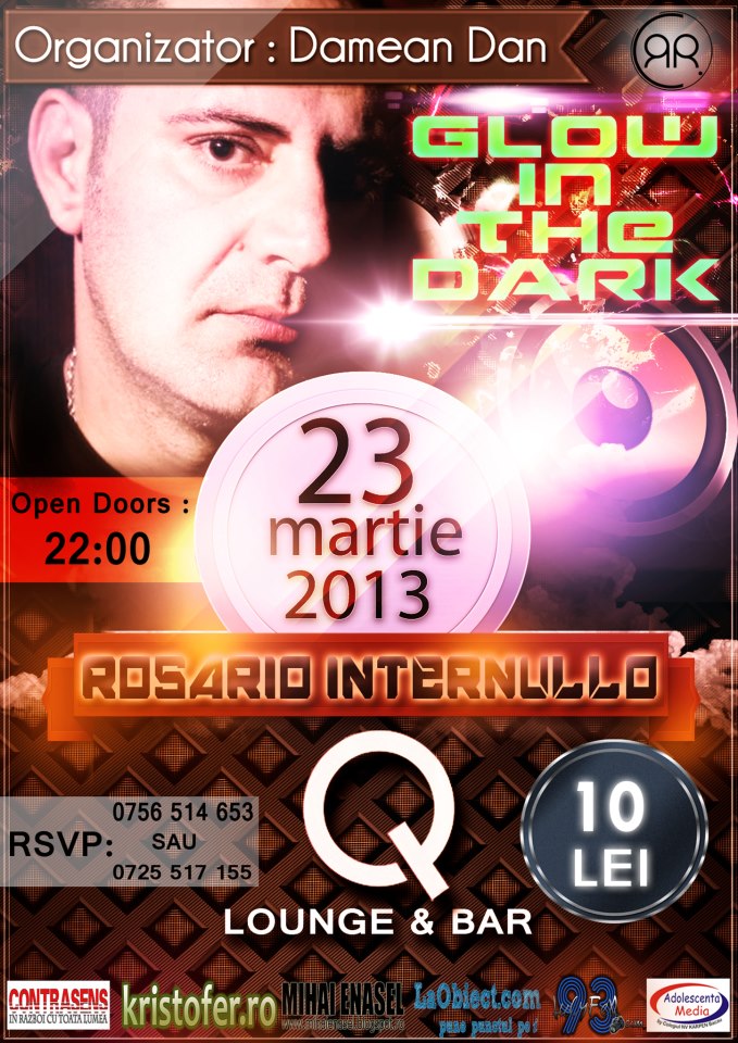 Rosario Internullo vine sâmbătă, 23 martie 2013, în Q Lounge Bar din Bacău. Organizatorii spun că „Glow in the dark” este o petrecere cu totul și cu totul specială. De ce? Păi pentru că fiecare persoană prezentă va primi câte o brățară glow. Sunt curios dacă petrecăreții vor purta aceste brățări.
