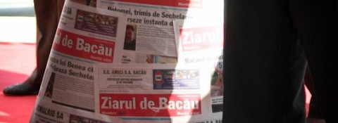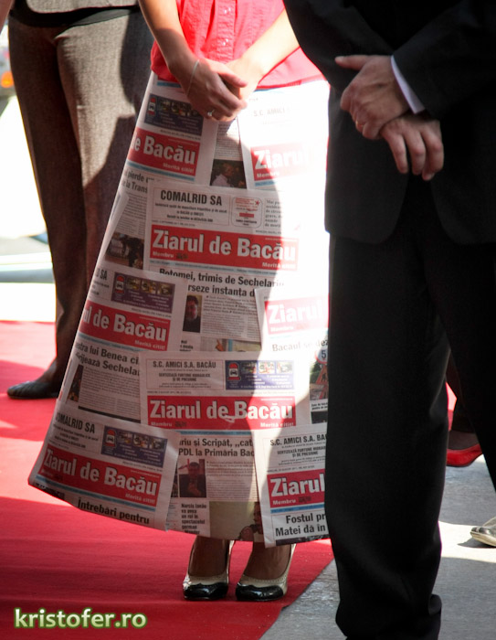 11:28 – Isi face aparitia o domnisoara cu o fusta confectionata din coperti ale Ziarului de Bacau. O idee misto de promovare! Titlurile au fost atent alese.