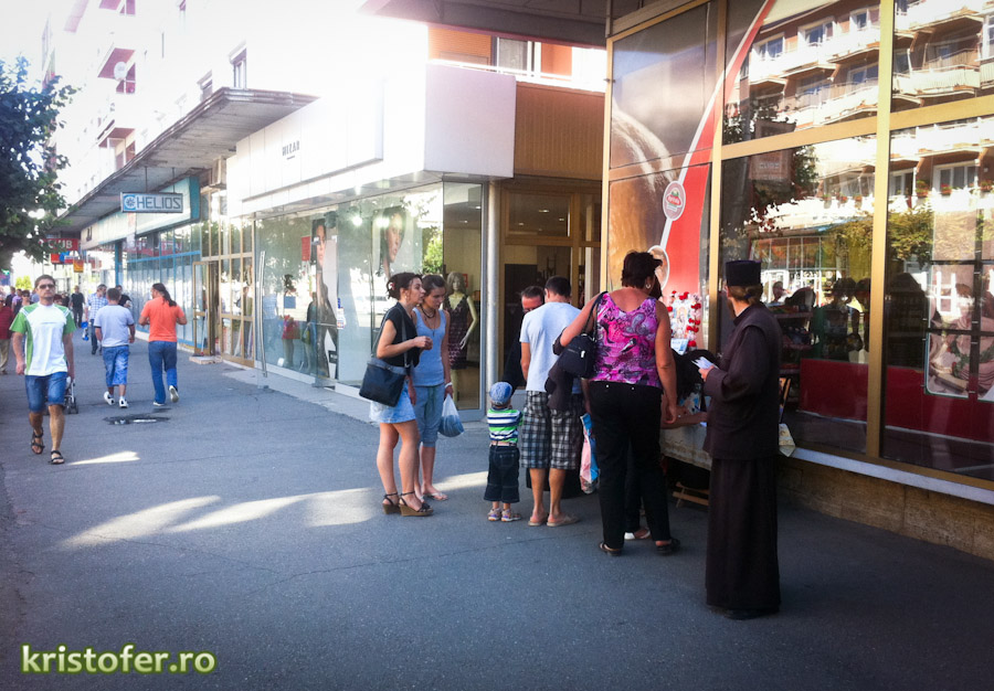 Va mai amintiti de postul din luna mai in care vorbeam despre miruirea la colt de strada? Arhiepiscopia Romanului si Bacaului spune ca astfel de practici sunt interzise si ca cei care recurg la asemenea actiuni sunt doar niste impostori. Impostori sau nu, azi era aglomeratie la „taraba sfanta” din centrul Bacaului (foto jos).