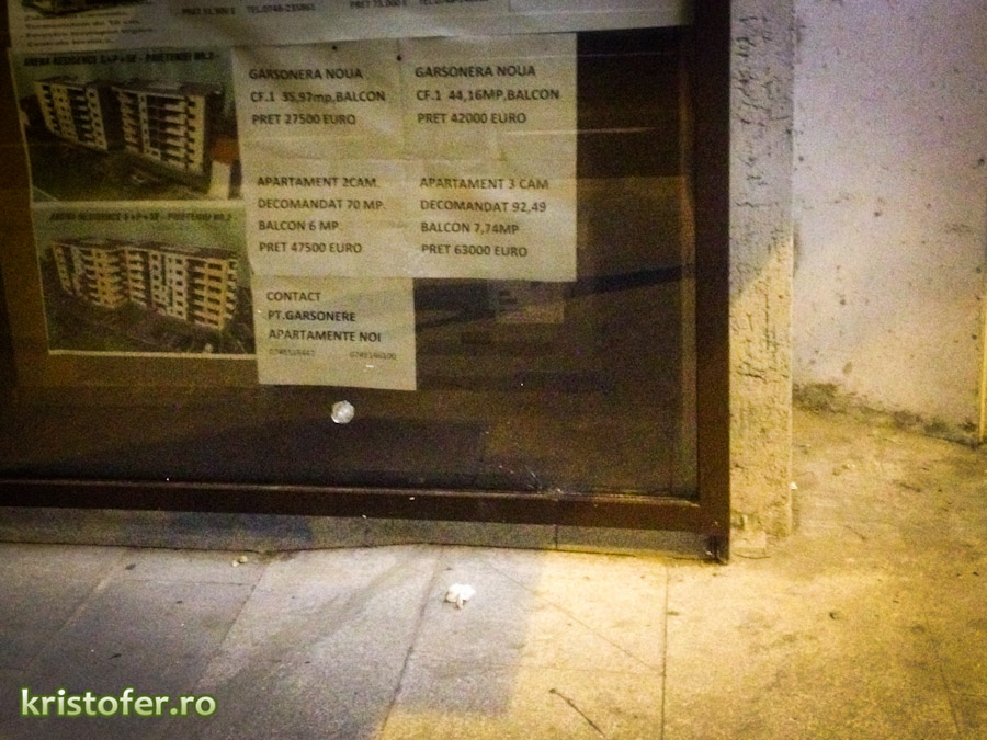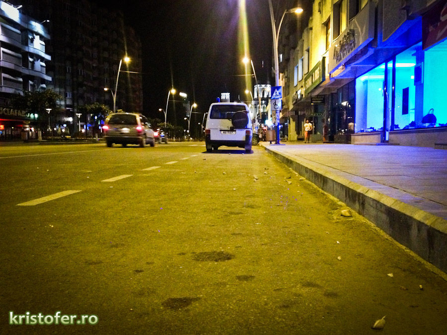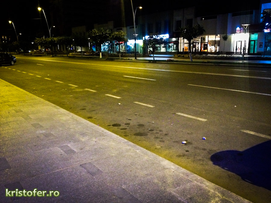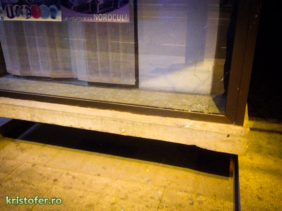 Aceleași lucruri s-au întâmplat și aseară, plus câteva daune materiale: pietrele au ajuns în două geamuri de la magazinele de vizavi, semn că individul și-a perfecționat skillurile, ca să zic așa. „Teroare în Bacău” ar titra tabloidele.