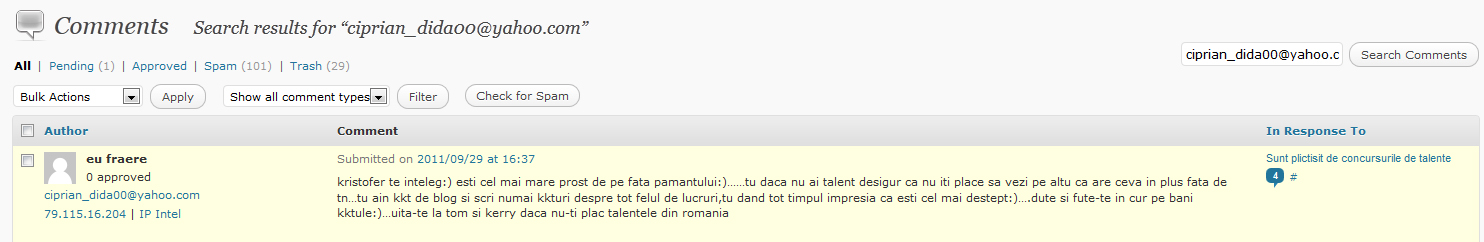 Young Feftee este un tanar talentat din Bacau pe care il apreciez si pe care l-am remarcat lucrand la cateva productii hip-hop destul de reusite. Din pacate, un comentariu lasat astazi de Ciprian (aka Young Feftee) la articolul meu in care spuneam ca m-am plictisit de concursurile de talente demonstreaza ca degeaba este un tanar de perspectiva daca nu se pricepe sa isi gestionezi nervii sau crizele de personalitate. Sau limbajul de rapper mult prea colorat.