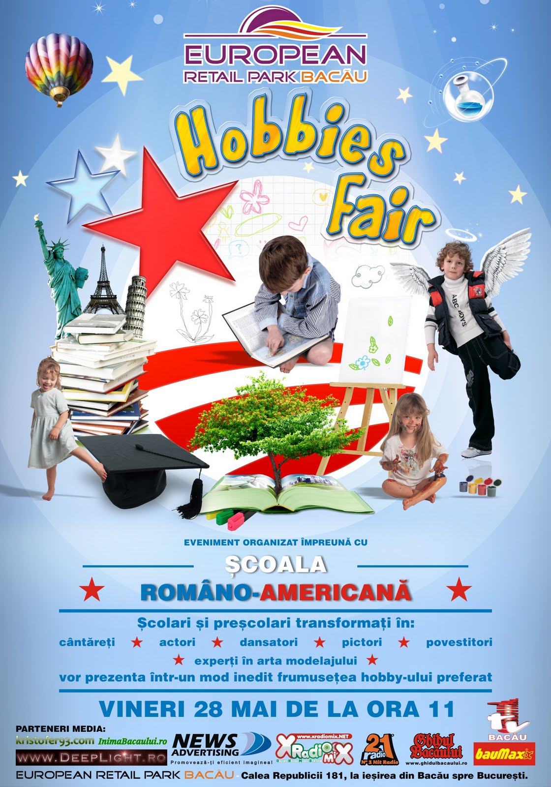 Vineri, 28 mai 2010, Scoala Romano-Americana si European Retail Park organizeaza, in Promenada Mall Bacau, Hobbies Fair, un eveniment realizat de scolari si prescolari care isi vor prezenta hobby-ul favorit, transformandu-se in cantareti, actori, dansatori, pictori sau povestitori.