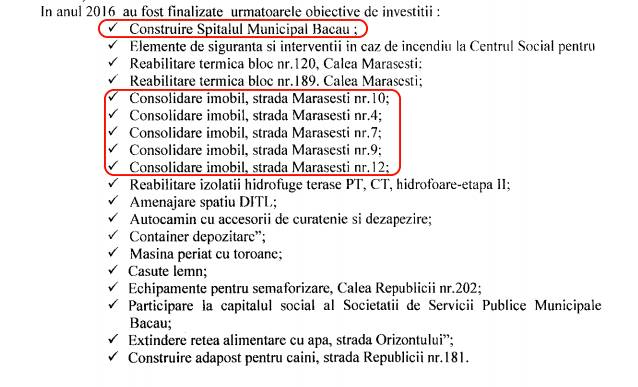 În raportul final privind execuția bugetară pe anul 2016 la nivelul municipiului Bacău, întocmit și semnat de primarul municipiului Bacău, este prezentată, la pagina 14, o listă ce include 19 obiective de investiții finalizate. Printre ele se regăsesc cel puțin 6 investiții care nu doar că sunt departe de a fi realizate, ci se află în execuție sau, mai grav, lucrările încă nu au fost demarate: