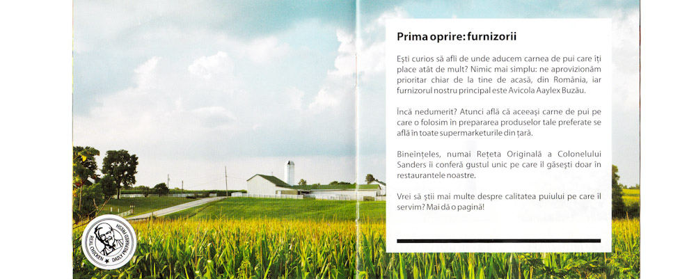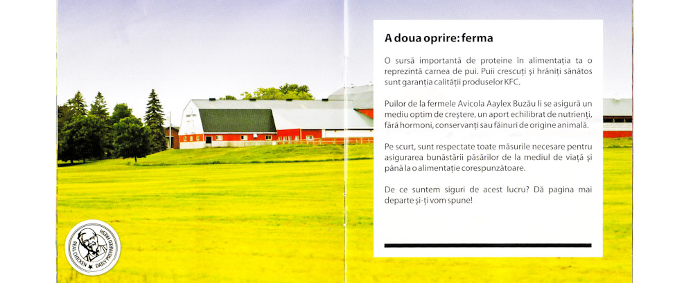 „Fast-fooderii” de la KFC au o noua brosura care, vezi doamne, ne dezvaluie „Secretul gustului KFC”. Din start, tin sa va spun ca nu imi place mancarea de la KFC. De fiecare data cand mananc de aici, toate caile mele respiratorii imi ard, si nu neaparat de la gustul picant. De aceea prefer McDonald’s in detrimentul KFC. Dar asta tine de gusturile mele.
