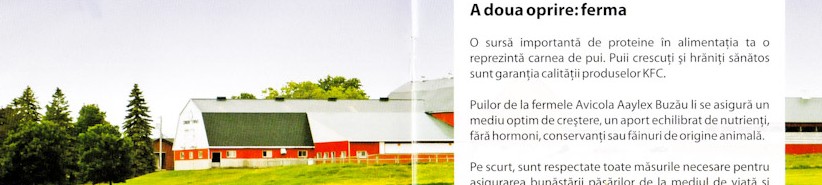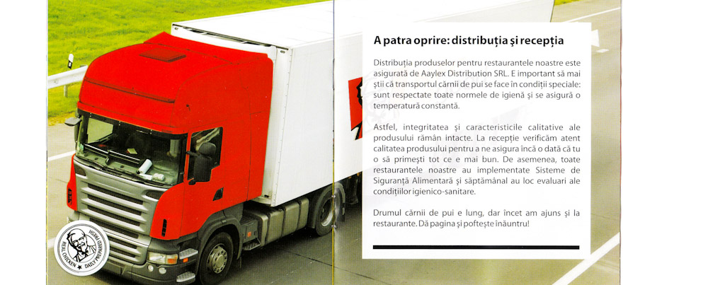 Sa revenim la brosura. Au incercat sa o faca targetata pe consumatorul roman si nu prea le-a iesit. Cel putin asta vad eu din poze. Au zis ca furnizorul lor este Avicola Aayalex Buzau si arata o fotografie cu o ferma de prin America. La fel si cu distributia si receptia. Ayalex Distribution Buzau, avand atasata o fotografie cu un camion pe autostrada.