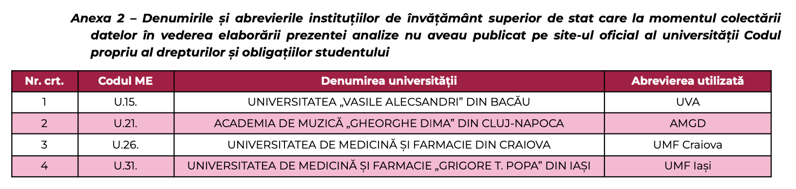 Trebuie să precizez din capul locului că tot ce vine de la ANOSR (Alianţa Naţională a Organizaţiilor Studenţeşti din România) trebuie luat cu un gram de sare și supus unei analize suplimentară. De ce spun asta? În primul rând, UVAB apare, în raportul alianței, pe lista roșie și cumva a rușinii a instituțiilor de învățământ superior care „nu aveau publicat pe site-ul oficial al universității Codul propriu al drepturilor și obligațiilor studentului„.